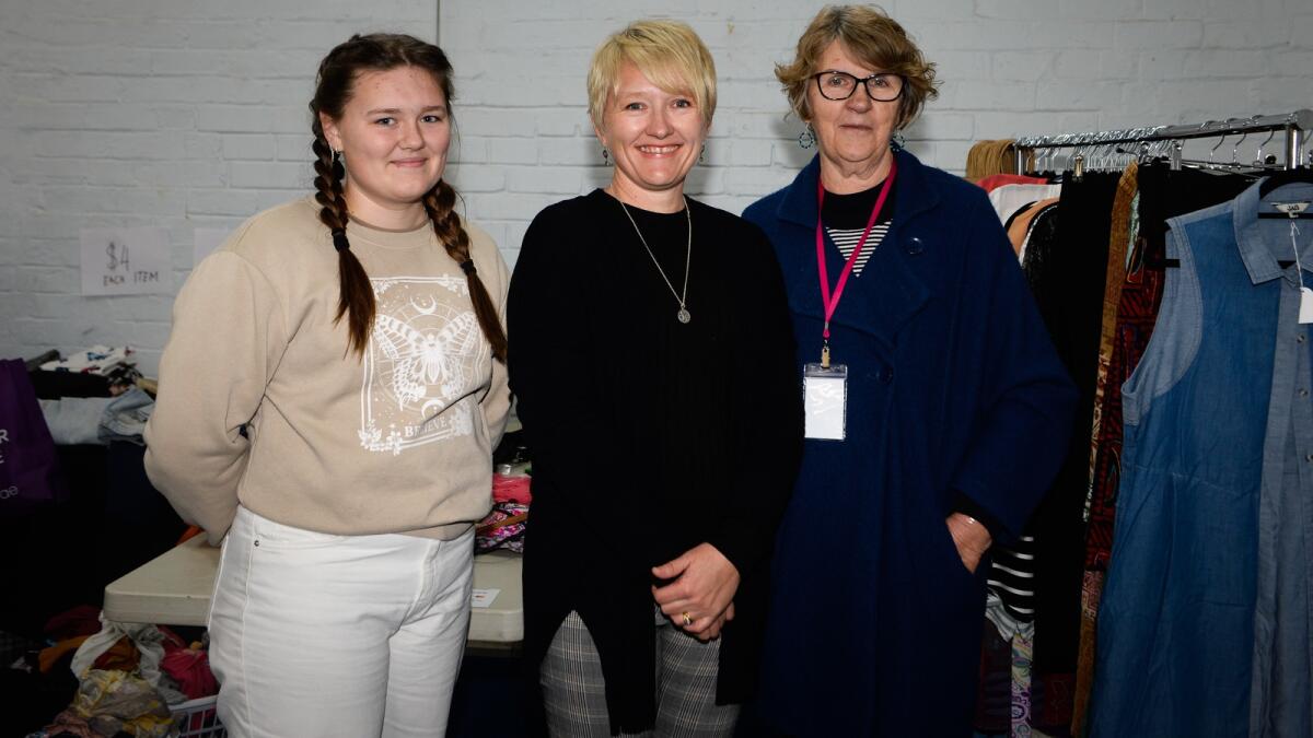 Trash to treasure: Bella and Gina O’Dwyer with stallholder Diane Langton.
