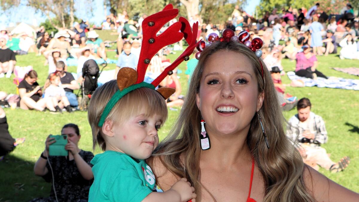 Hannah Seymour, nee Hockley, with 20-month-old Noah, at Seymour’s Carols in the Park. Photo: Wayne Herring