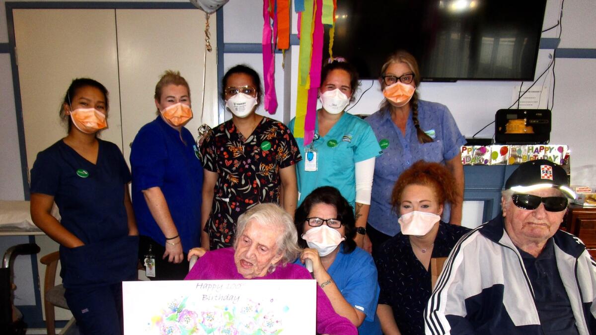 Celebration: Ally Fisher with staff and residents at Barrabill House on her 100th birthday.