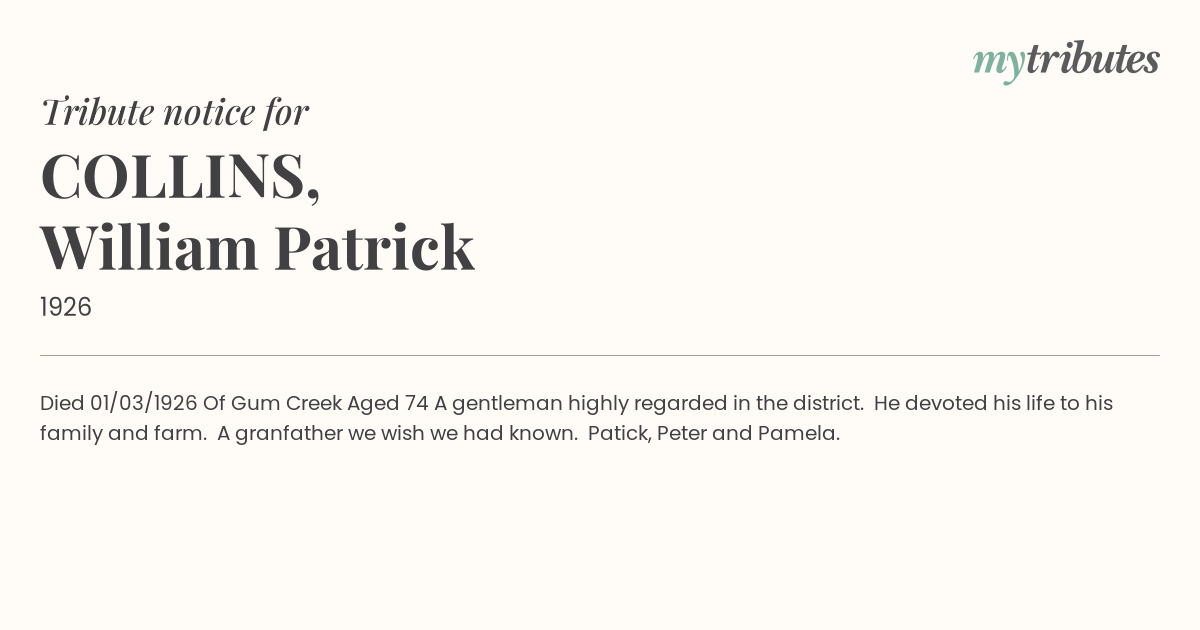 16°CDied 01/03/1926 Of Gum Creek Aged 74 A gentleman highly regarded in the district. He devoted his life to his family and farm. A granfather we wish we had known. Patick, Peter and Pamela.