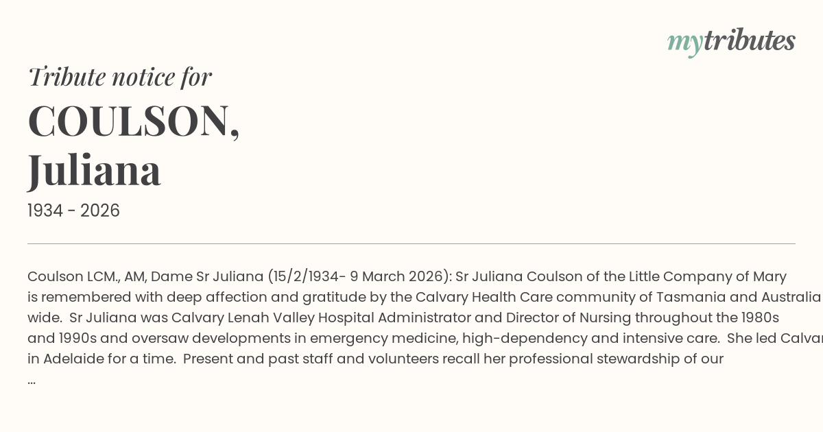 16°CCoulson LCM., AM, Dame Sr Juliana (15/2/1934- 9 March 2026): Sr Juliana Coulson of the Little Company of Mary is remembered with deep affection and gratitude by the Calvary Health Care community of Tasmania and Australia wide. Sr Juliana was Calvary Lenah Valley Hospital Administrator and Director of Nursing throughout the 1980s and 1990s and oversaw developments in emergency medicine, high-dependency and intensive care. She led Calvary in Adelaide for a time. Present and past staff and volunteers recall her professional stewardship of our hospital and especially her warm 'hello' and kindness.