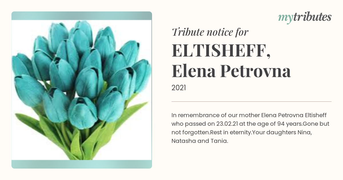16°CIn remembrance of our mother Elena Petrovna Eltisheff who passed on 23.02.21 at the age of 94 years.