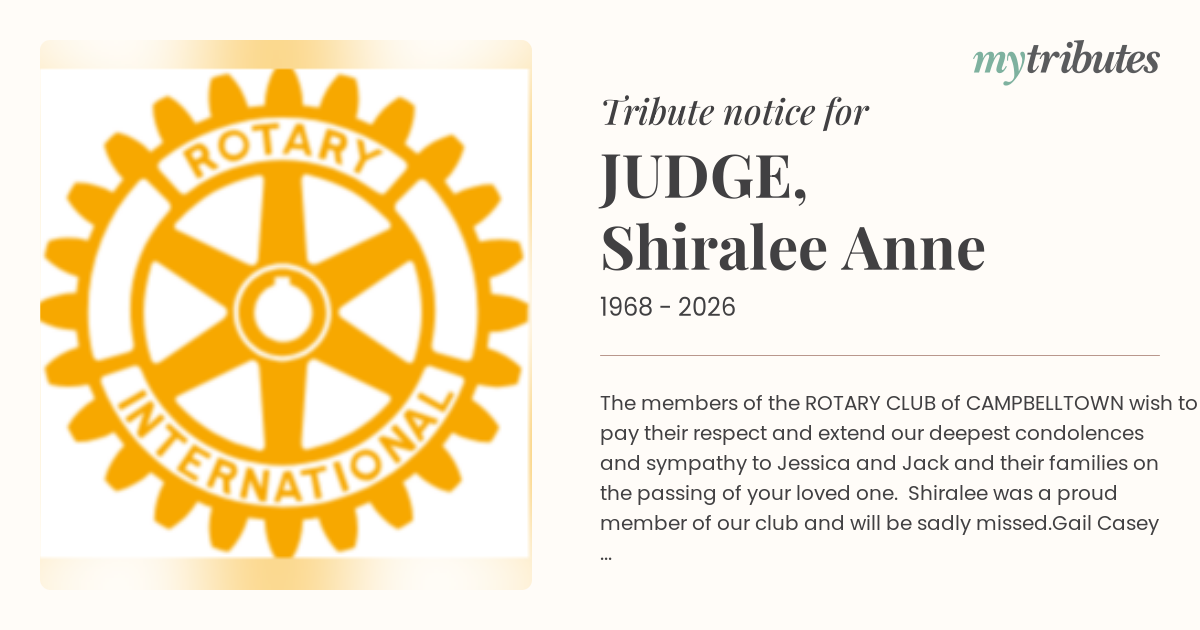 16°CThe members of the ROTARY CLUB of CAMPBELLTOWN wish to pay their respect and extend our deepest condolences and sympathy to Jessica and Jack and their families on the passing of your loved one. Shiralee was a proud member of our club and will be sadly missed.