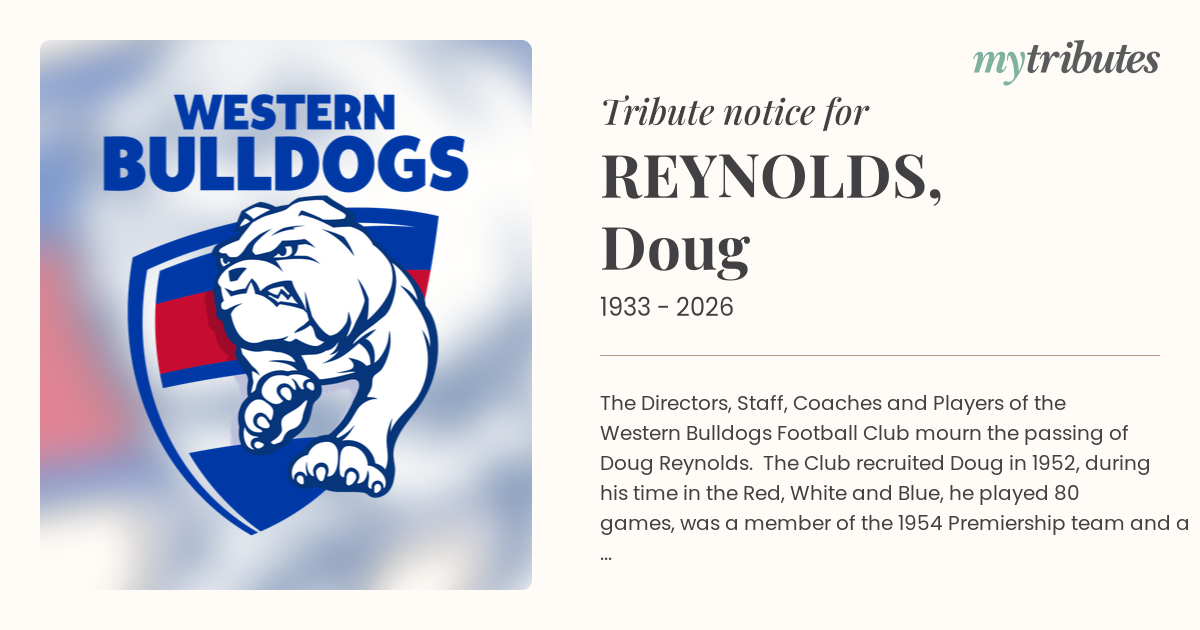 16°CThe Directors, Staff, Coaches and Players of the Western Bulldogs Football Club mourn the passing of Doug Reynolds. The Club recruited Doug in 1952, during his time in the Red, White and Blue, he played 80 games, was a member of the 1954 Premiership team and a life member of the Club.