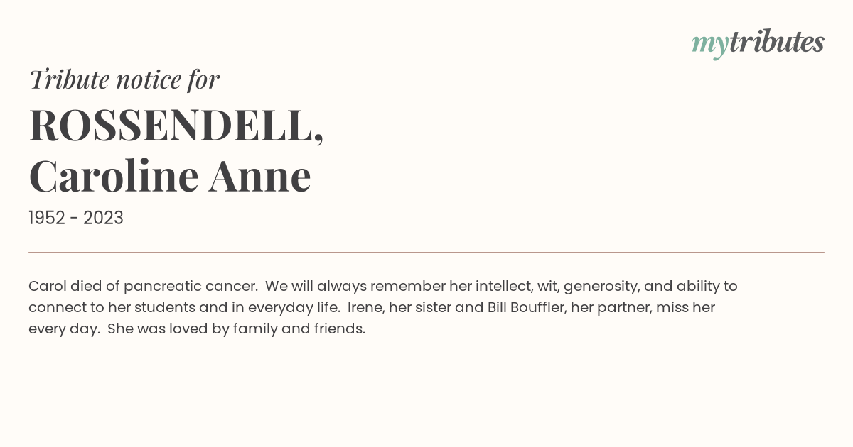 16°CCarol died of pancreatic cancer. We will always remember her intellect, wit, generosity, and ability to connect to her students and in everyday life. Irene, her sister and Bill Bouffler, her partner, miss her every day. She was loved by family and friends.