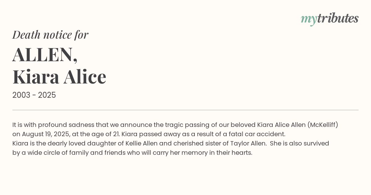 16°CIt is with profound sadness that we announce the tragic passing of our beloved Kiara Alice Allen (McKelliff) on August 19, 2025, at the age of 21. Kiara passed away as a result of a fatal car accident.