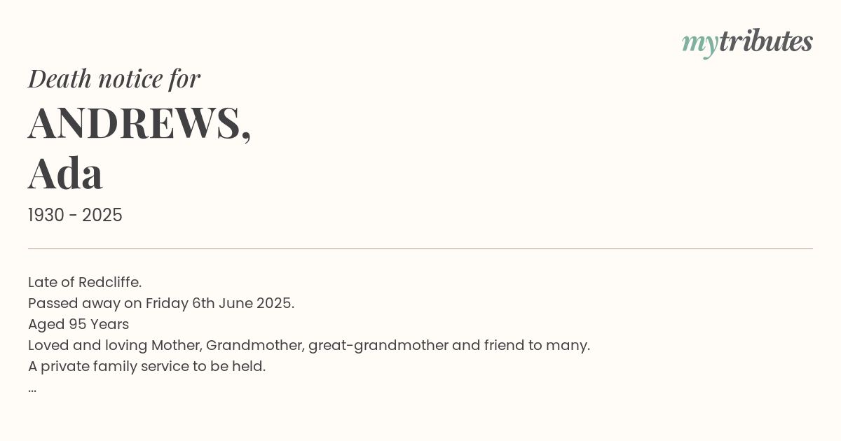 Loved and loving Mother, Grandmother, great-grandmother and friend to many.