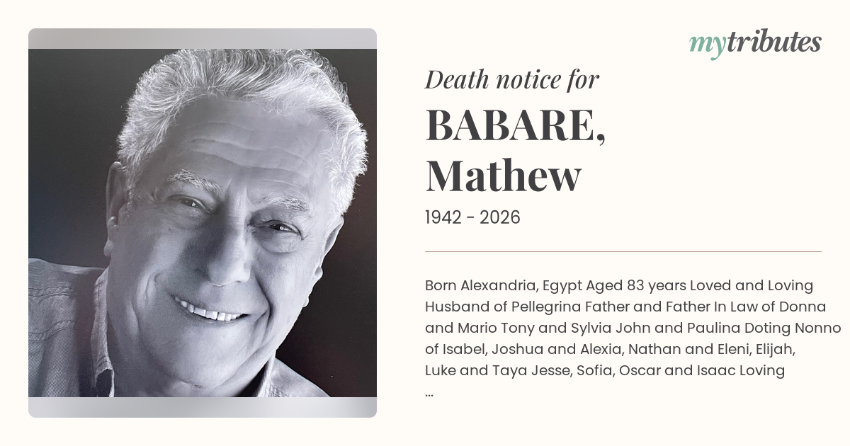 16°CBorn Alexandria, Egypt Aged 83 years Loved and Loving Husband of Pellegrina Father and Father In Law of Donna and Mario Tony and Sylvia John and Paulina Doting Nonno of Isabel, Joshua and Alexia, Nathan and Eleni, Elijah, Luke and Taya Jesse, Sofia, Oscar and Isaac Loving Brother and Brother In Law Now in Gods Care