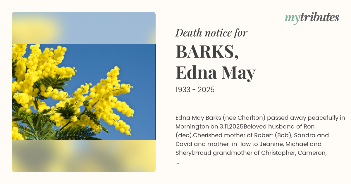 16°CEdna May Barks (nee Charlton) passed away peacefully in Mornington on 3.11.2025