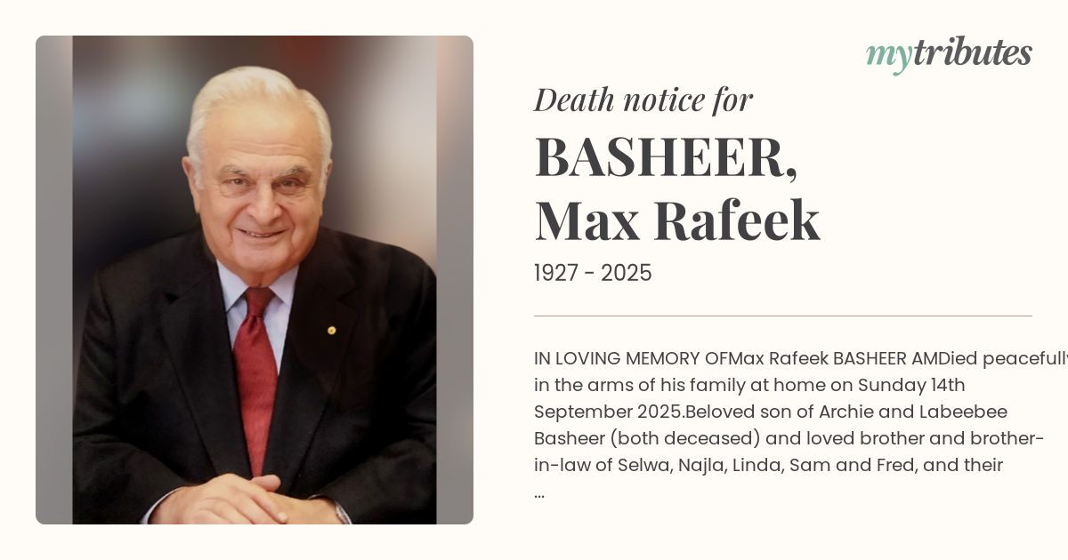 Beloved son of Archie and Labeebee Basheer (both deceased) and loved brother and brother-in-law of Selwa, Najla, Linda, Sam and Fred, and their spouses Allan, Jim, Bushra (all deceased) and Nadia.