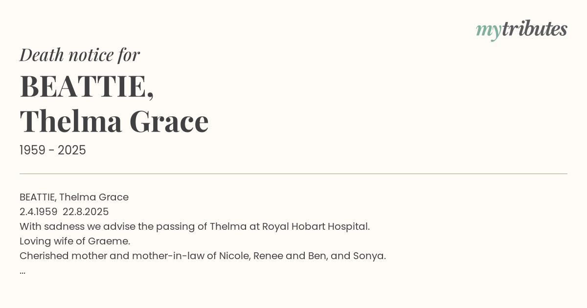 With sadness we advise the passing of Thelma at Royal Hobart Hospital.