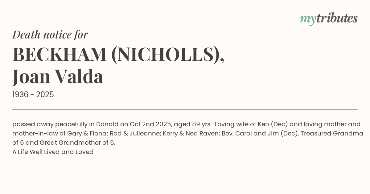 16°Cpassed away peacefully in Donald on Oct 2nd 2025, aged 89 yrs. Loving wife of Ken (Dec) and loving mother and mother-in-law of Gary & Fiona; Rod & Julieanne; Kerry & Ned Raven; Bev, Carol and Jim (Dec). Treasured Grandma of 6 and Great Grandmother of 5.