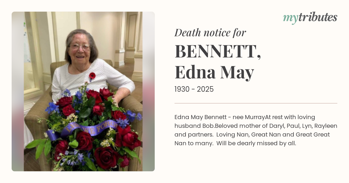Beloved mother of Daryl, Paul, Lyn, Rayleen and partners. Loving Nan, Great Nan and Great Great Nan to many. Will be dearly missed by all.