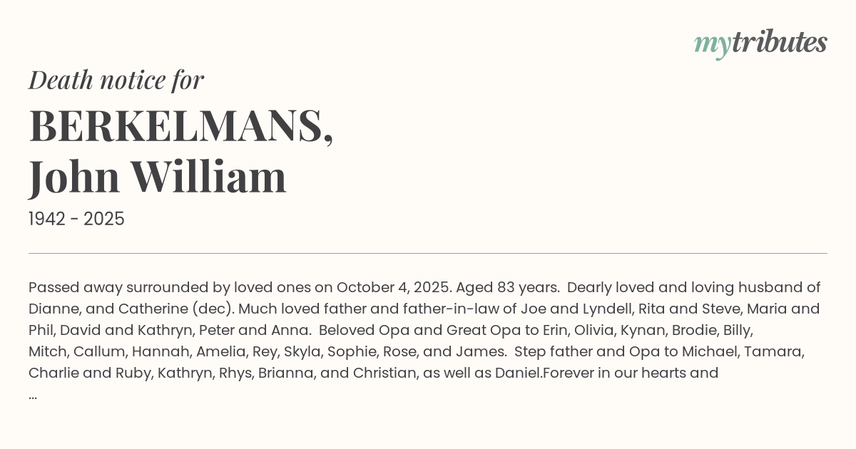 16°CPassed away surrounded by loved ones on October 4, 2025. Aged 83 years. Dearly loved and loving husband of Dianne, and Catherine (dec). Much loved father and father-in-law of Joe and Lyndell, Rita and Steve, Maria and Phil, David and Kathryn, Peter and Anna. Beloved Opa and Great Opa to Erin, Olivia, Kynan, Brodie, Billy, Mitch, Callum, Hannah, Amelia, Rey, Skyla, Sophie, Rose, and James. Step father and Opa to Michael, Tamara, Charlie and Ruby, Kathryn, Rhys, Brianna, and Christian, as well as Daniel.