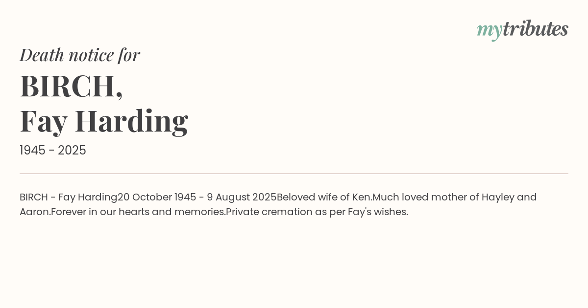 Private cremation as per Fay's wishes.