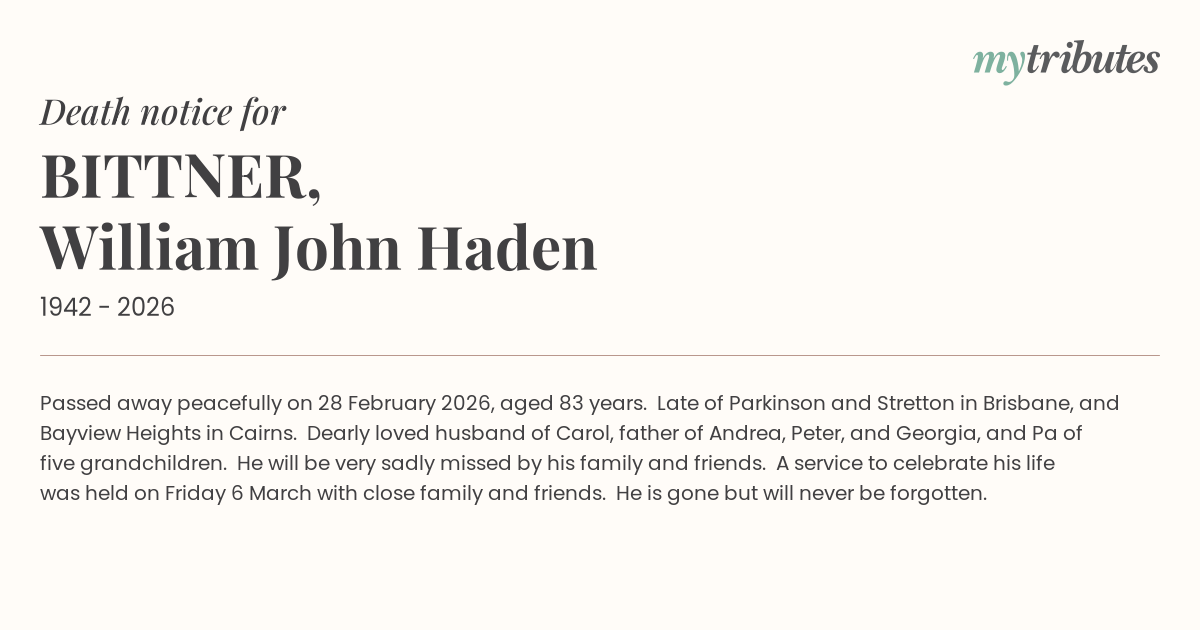 16°CPassed away peacefully on 28 February 2026, aged 83 years. Late of Parkinson and Stretton in Brisbane, and Bayview Heights in Cairns. Dearly loved husband of Carol, father of Andrea, Peter, and Georgia, and Pa of five grandchildren. He will be very sadly missed by his family and friends. A service to celebrate his life was held on Friday 6 March with close family and friends. He is gone but will never be forgotten.