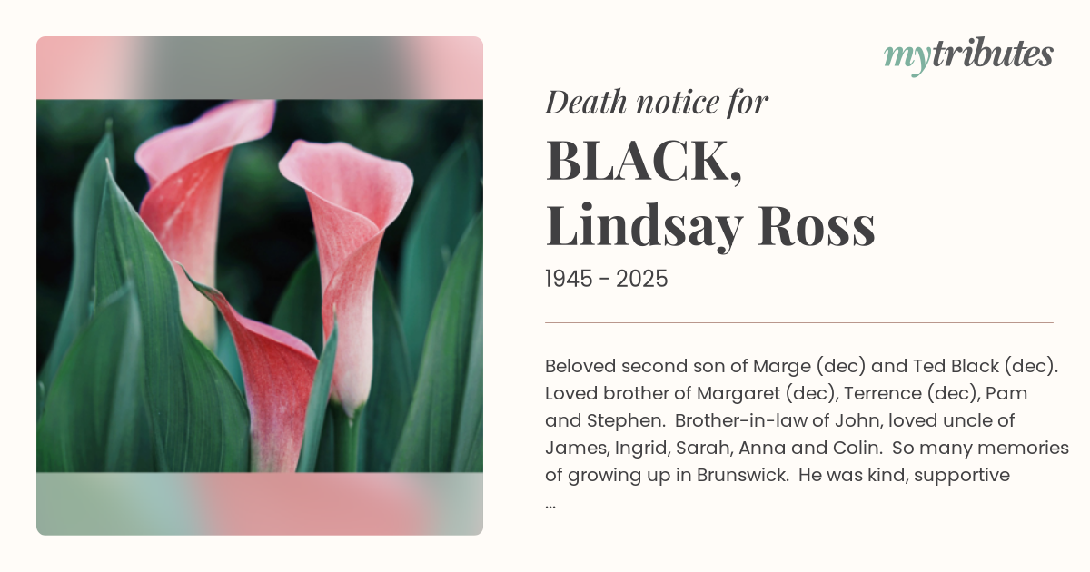 16°CBeloved second son of Marge (dec) and Ted Black (dec). Loved brother of Margaret (dec), Terrence (dec), Pam and Stephen. Brother-in-law of John, loved uncle of James, Ingrid, Sarah, Anna and Colin. So many memories of growing up in Brunswick. He was kind, supportive and generous of spirit. Our family’s “Memory Keeper”. He ain’t heavy – he was our brother. Pam and Stephen.