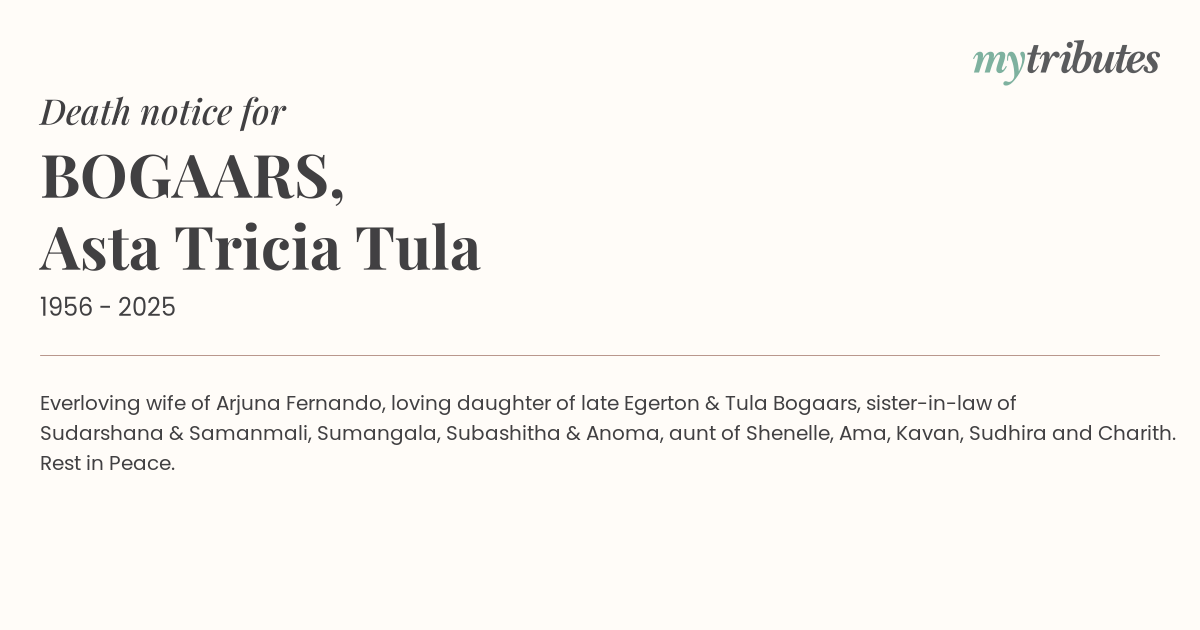 16°CEverloving wife of Arjuna Fernando, loving daughter of late Egerton & Tula Bogaars, sister-in-law of Sudarshana & Samanmali, Sumangala, Subashitha & Anoma, aunt of Shenelle, Ama, Kavan, Sudhira and Charith.