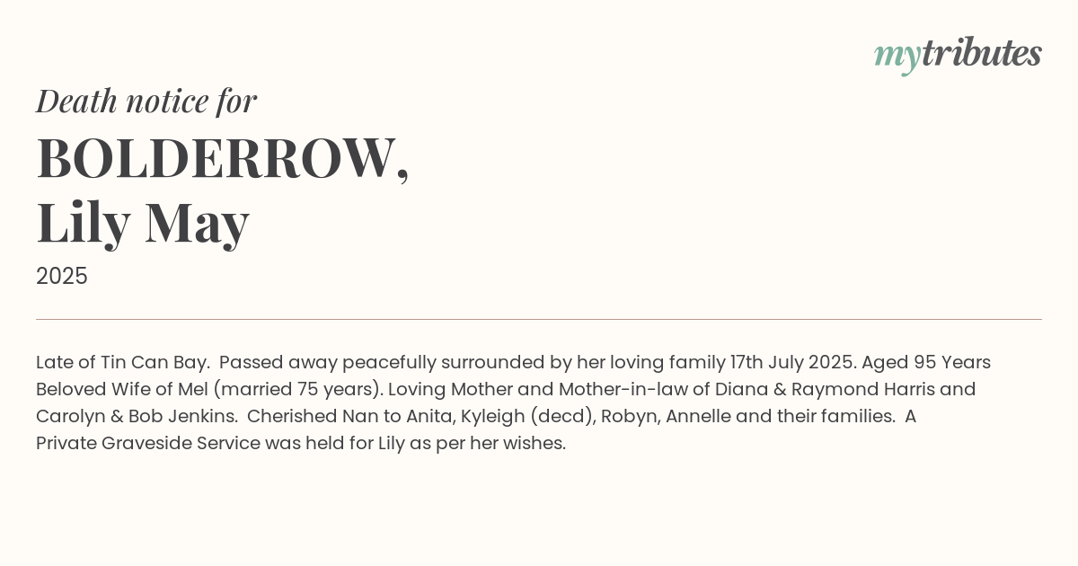 16°CLate of Tin Can Bay. Passed away peacefully surrounded by her loving family 17th July 2025.