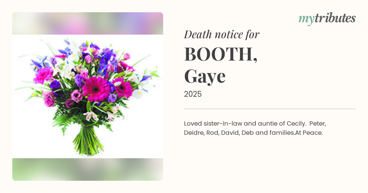 16°CLoved sister-in-law and auntie of Cecily. Peter, Deidre, Rod, David, Deb and families.