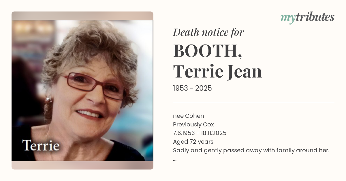 16°Cnee Cohen Previously Cox 7.6.1953 - 18.11.2025 Aged 72 years Sadly and gently passed away with family around her. Treasured wife of Rob. Former wife of Tony (dec). Adored mum of Ian (dec), Lee and Hayley and mother-in-law of Ann-Marie. Cherished nanna of Ethan and Riley. Our hearts are empty and heavy. There's no more pain; you're now with family and friends.
