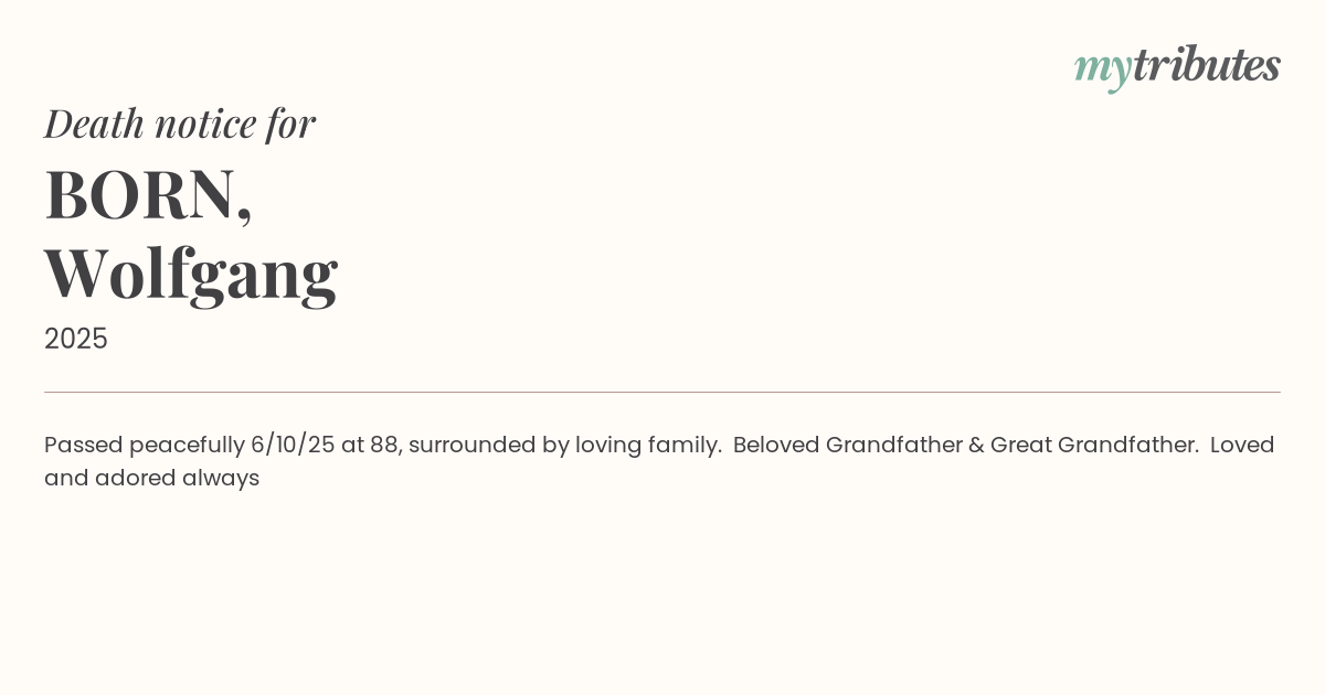 16°CPassed peacefully 6/10/25 at 88, surrounded by loving family. Beloved Grandfather & Great Grandfather. Loved and adored always