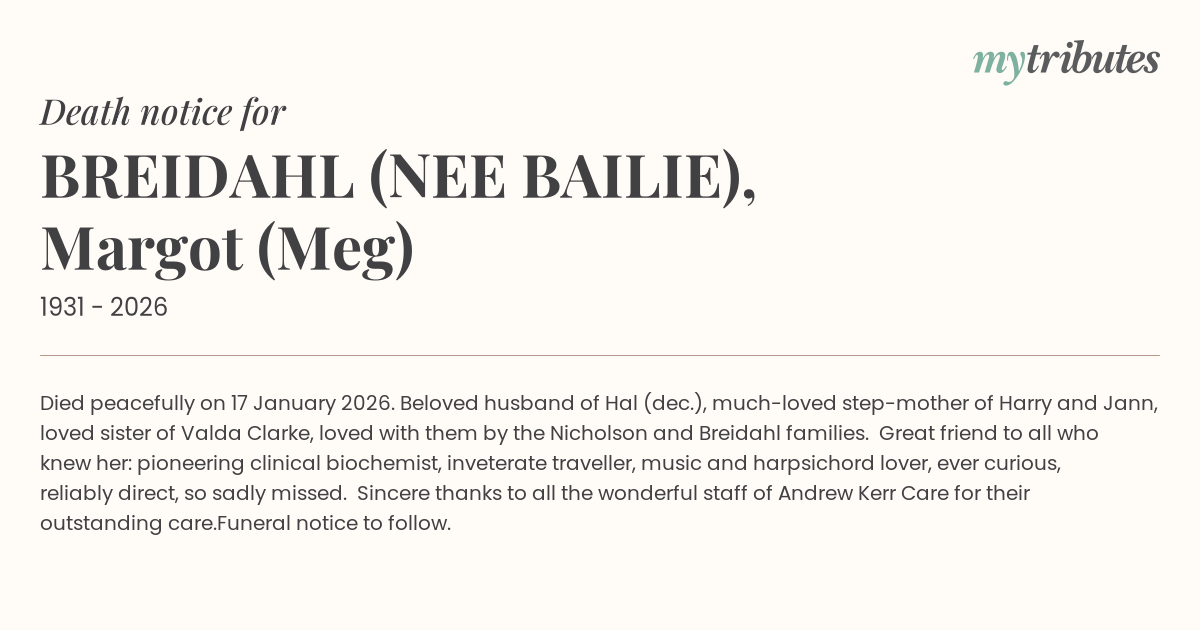 16°CDied peacefully on 17 January 2026. Beloved husband of Hal (dec.), much-loved step-mother of Harry and Jann, loved sister of Valda Clarke, loved with them by the Nicholson and Breidahl families. Great friend to all who knew her: pioneering clinical biochemist, inveterate traveller, music and harpsichord lover, ever curious, reliably direct, so sadly missed. Sincere thanks to all the wonderful staff of Andrew Kerr Care for their outstanding care.