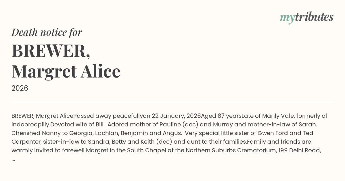 Family and friends are warmly invited to farewell Margret in the South Chapel at the Northern Suburbs Crematorium, 199 Delhi Road, North Ryde on Monday, 2 February 2026 at 1pm.