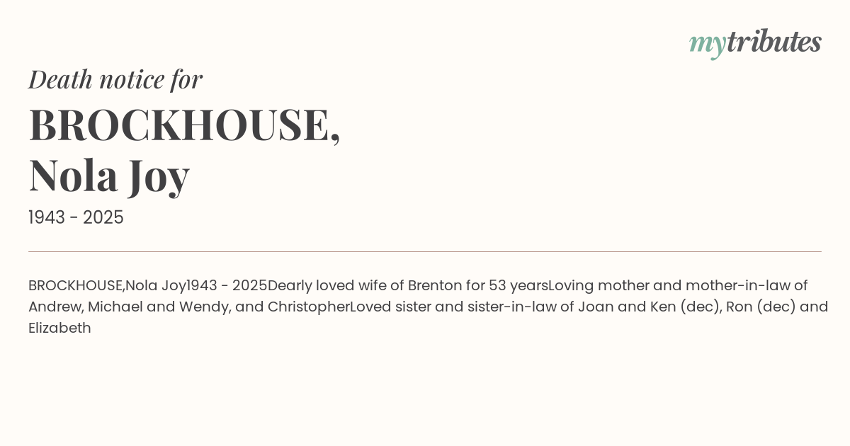 Loved sister and sister-in-law of Joan and Ken (dec), Ron (dec) and Elizabeth