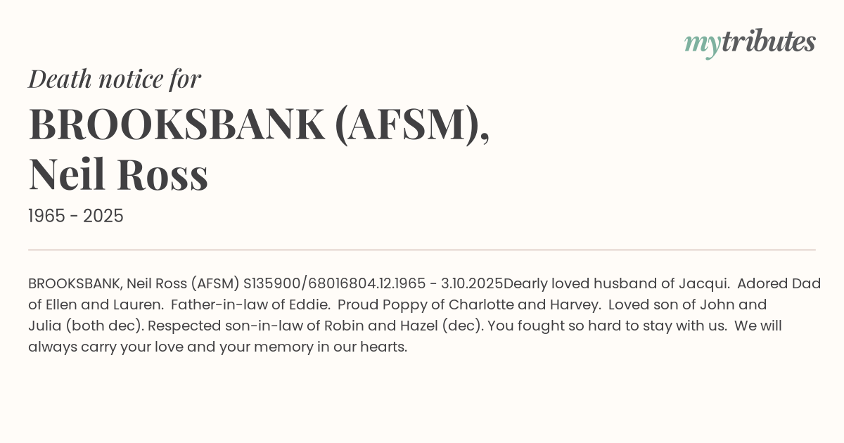 Dearly loved husband of Jacqui. Adored Dad of Ellen and Lauren. Father-in-law of Eddie. Proud Poppy of Charlotte and Harvey. Loved son of John and Julia (both dec). Respected son-in-law of Robin and Hazel (dec).
