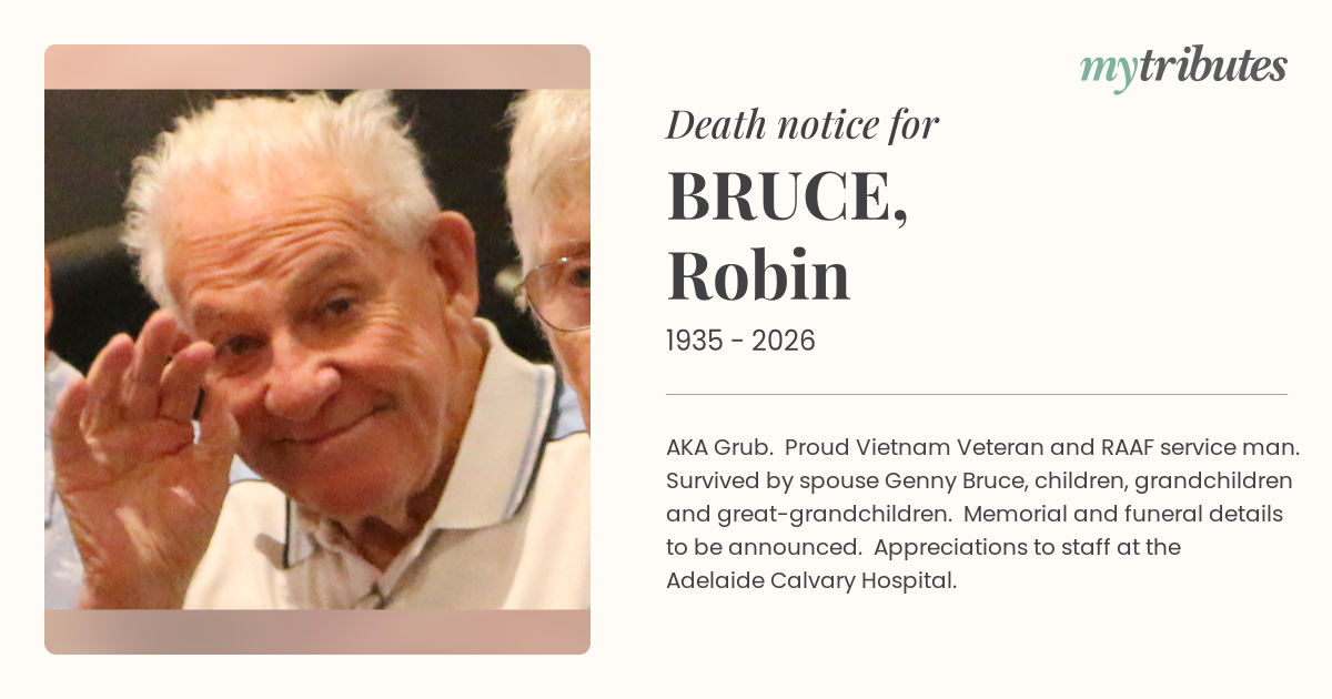 16°CAKA Grub. Proud Vietnam Veteran and RAAF service man. Survived by spouse Genny Bruce, children, grandchildren and great-grandchildren. Memorial and funeral details to be announced. Appreciations to staff at the Adelaide Calvary Hospital.