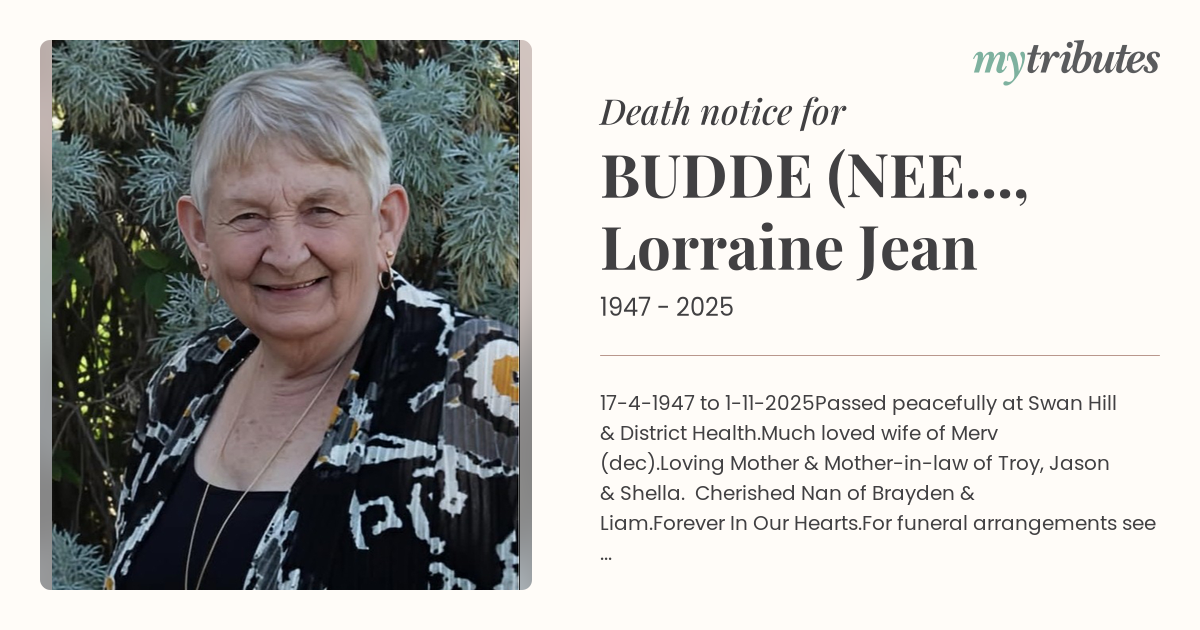 Loving Mother & Mother-in-law of Troy, Jason & Shella. Cherished Nan of Brayden & Liam.