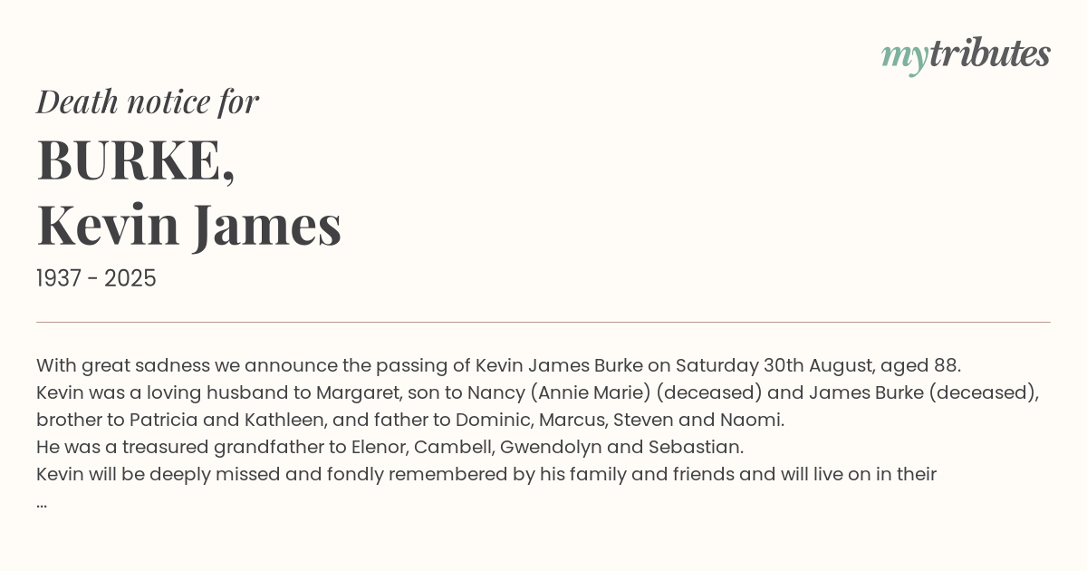 16°CWith great sadness we announce the passing of Kevin James Burke on Saturday 30th August, aged 88.