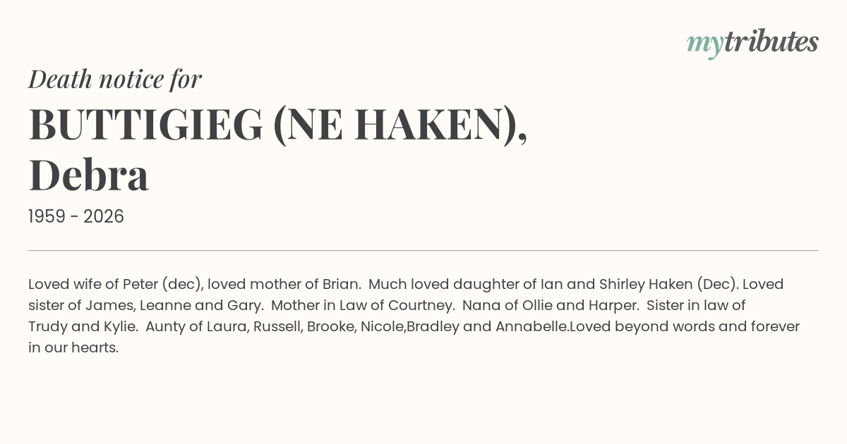 16°CLoved wife of Peter (dec), loved mother of Brian. Much loved daughter of Ian and Shirley Haken (Dec). Loved sister of James, Leanne and Gary. Mother in Law of Courtney. Nana of Ollie and Harper. Sister in law of Trudy and Kylie. Aunty of Laura, Russell, Brooke, Nicole,Bradley and Annabelle.