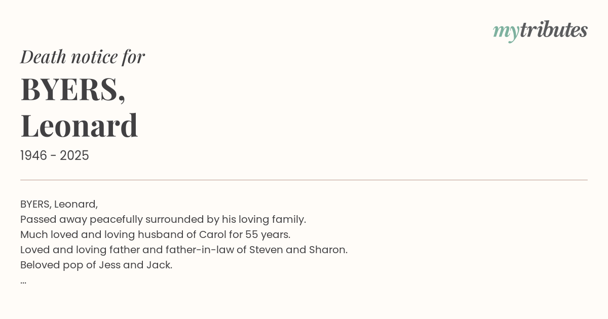 16°CBYERS, Leonard, Passed away peacefully surrounded by his loving family. Much loved and loving husband of Carol for 55 years. Loved and loving father and father-in-law of Steven and Sharon. Beloved pop of Jess and Jack. Our sincere thanks to all the staff of Oatlands MMPHC for their loving care shown to us all.