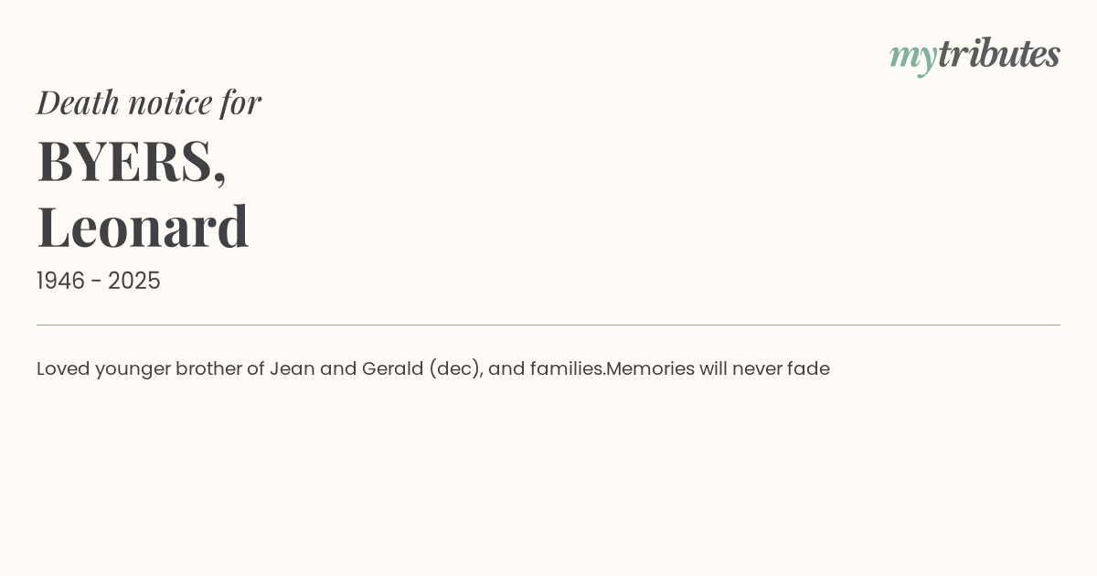 Loved younger brother of Jean and Gerald (dec), and families.Memories will never fade