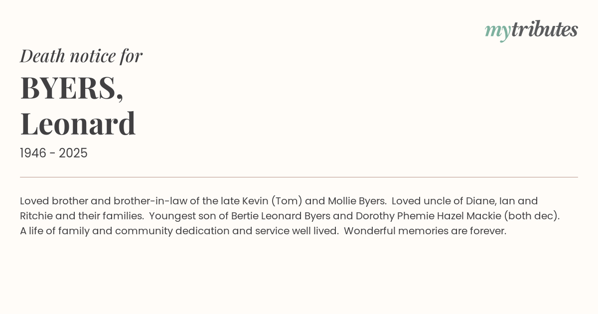 16°CLoved brother and brother-in-law of the late Kevin (Tom) and Mollie Byers. Loved uncle of Diane, Ian and Ritchie and their families. Youngest son of Bertie Leonard Byers and Dorothy Phemie Hazel Mackie (both dec). A life of family and community dedication and service well lived. Wonderful memories are forever.