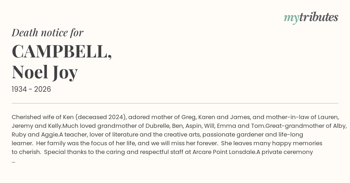 A teacher, lover of literature and the creative arts, passionate gardener and life-long learner. Her family was the focus of her life, and we will miss her forever. She leaves many happy memories to cherish.