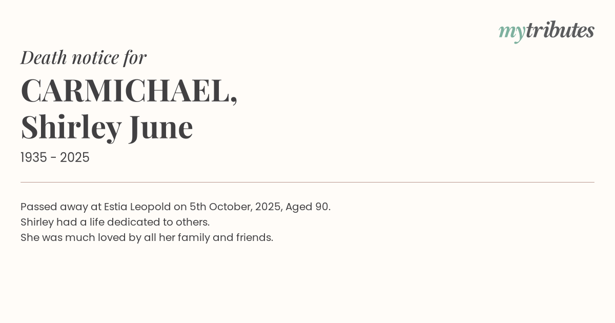 16°CPassed away at Estia Leopold on 5th October, 2025,