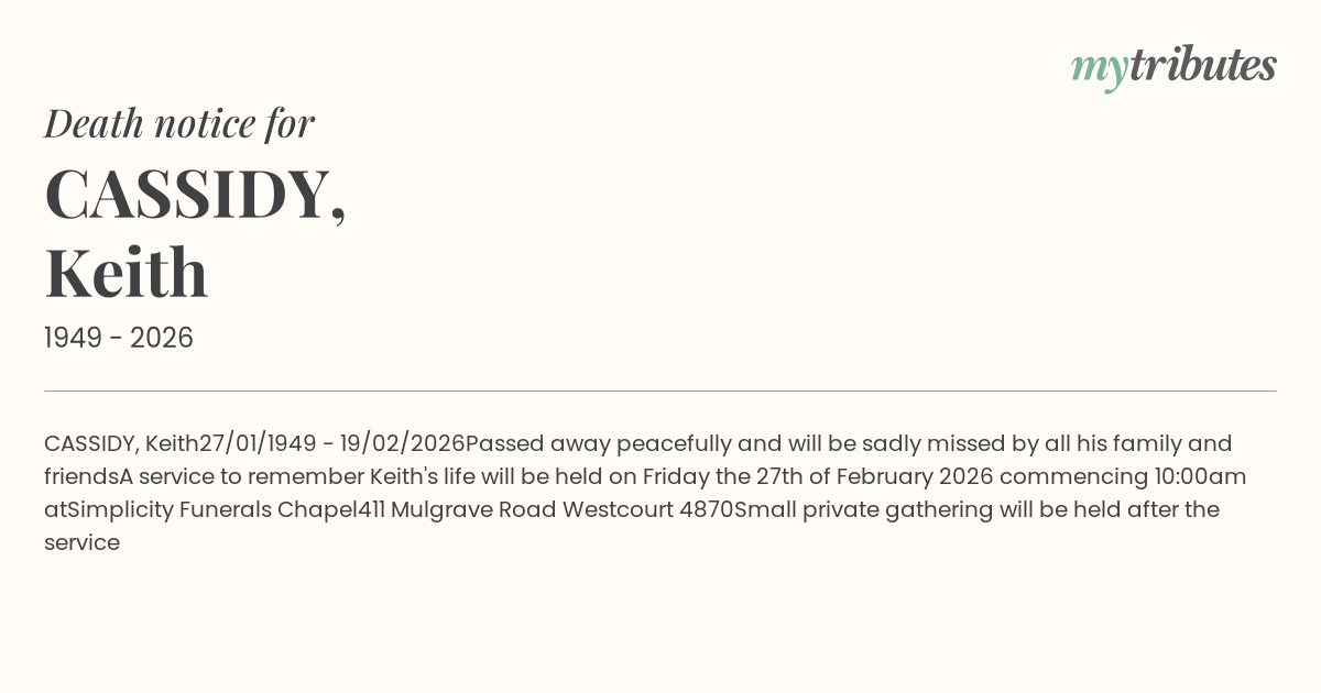 A service to remember Keith's life will be held on Friday the 27th of February 2026 commencing 10:00am at
