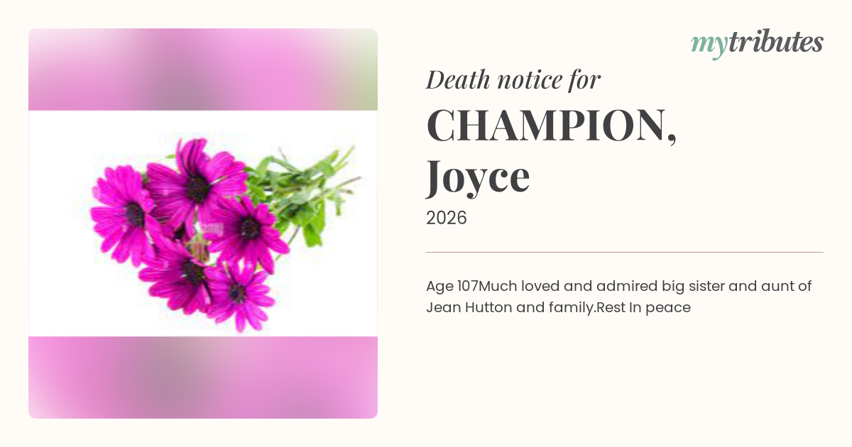 Much loved and admired big sister and aunt of Jean Hutton and family.