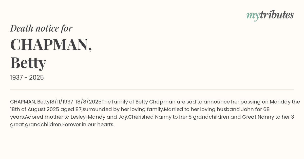 The family of Betty Chapman are sad to announce her passing on Monday the 18th of August 2025 aged 87,