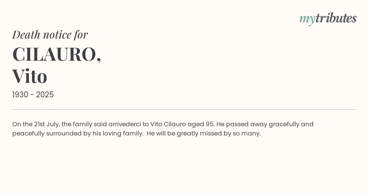 16°COn the 21st July, the family said arrivederci to Vito Cilauro aged 95. He passed away gracefully and peacefully surrounded by his loving family. He will be greatly missed by so many.