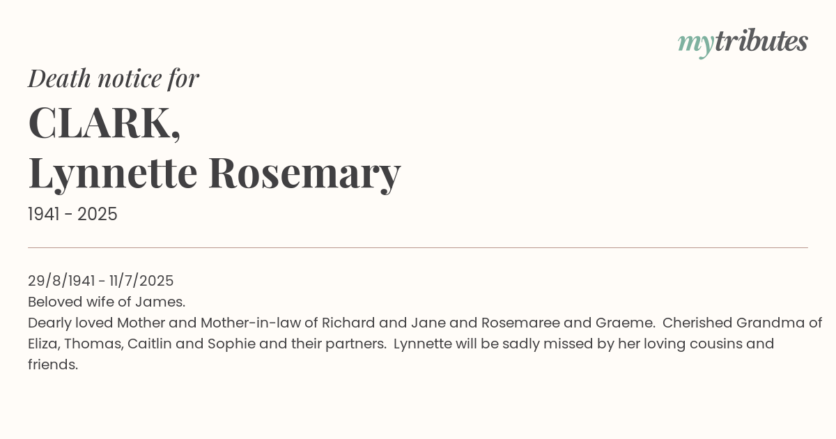 Dearly loved Mother and Mother-in-law of Richard and Jane and Rosemaree and Graeme. Cherished Grandma of Eliza, Thomas, Caitlin and Sophie and their partners. Lynnette will be sadly missed by her loving cousins and friends.