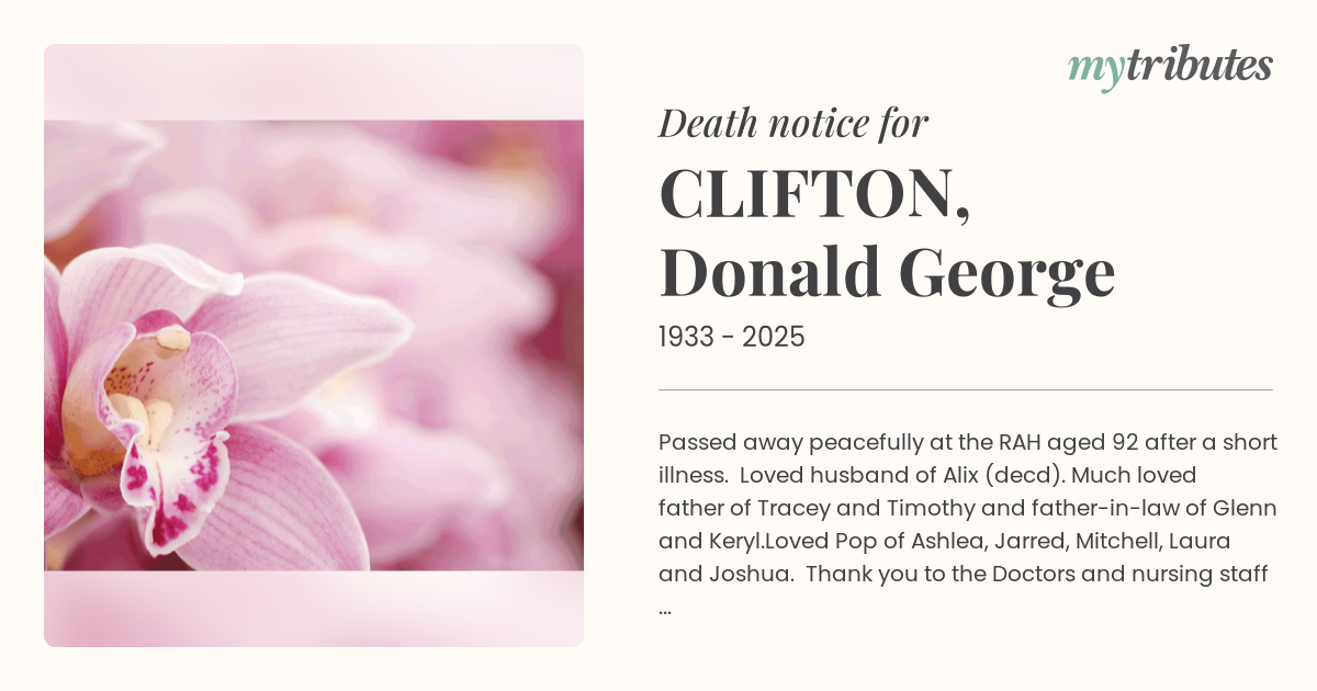 16°CPassed away peacefully at the RAH aged 92 after a short illness. Loved husband of Alix (dec’d). Much loved father of Tracey and Timothy and father-in-law of Glenn and Keryl.