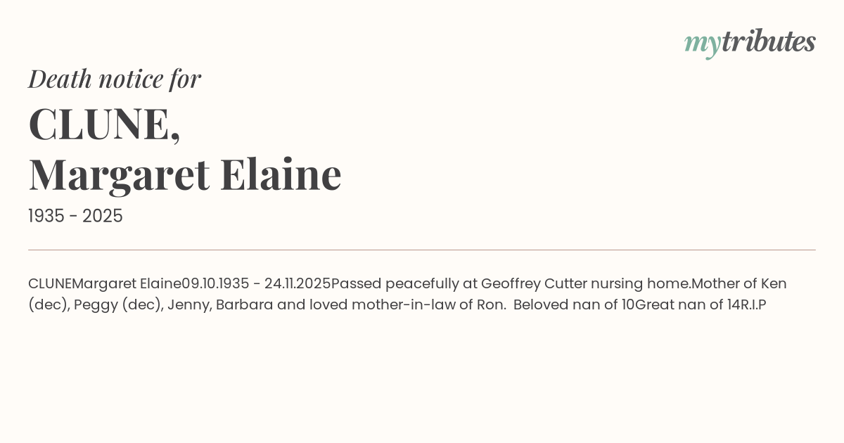 Mother of Ken (dec), Peggy (dec), Jenny, Barbara and loved mother-in-law