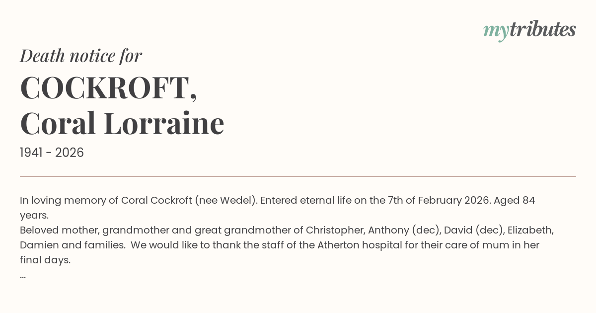 16°CIn loving memory of Coral Cockroft (nee Wedel). Entered eternal life on the 7th of February 2026. Aged 84 years.