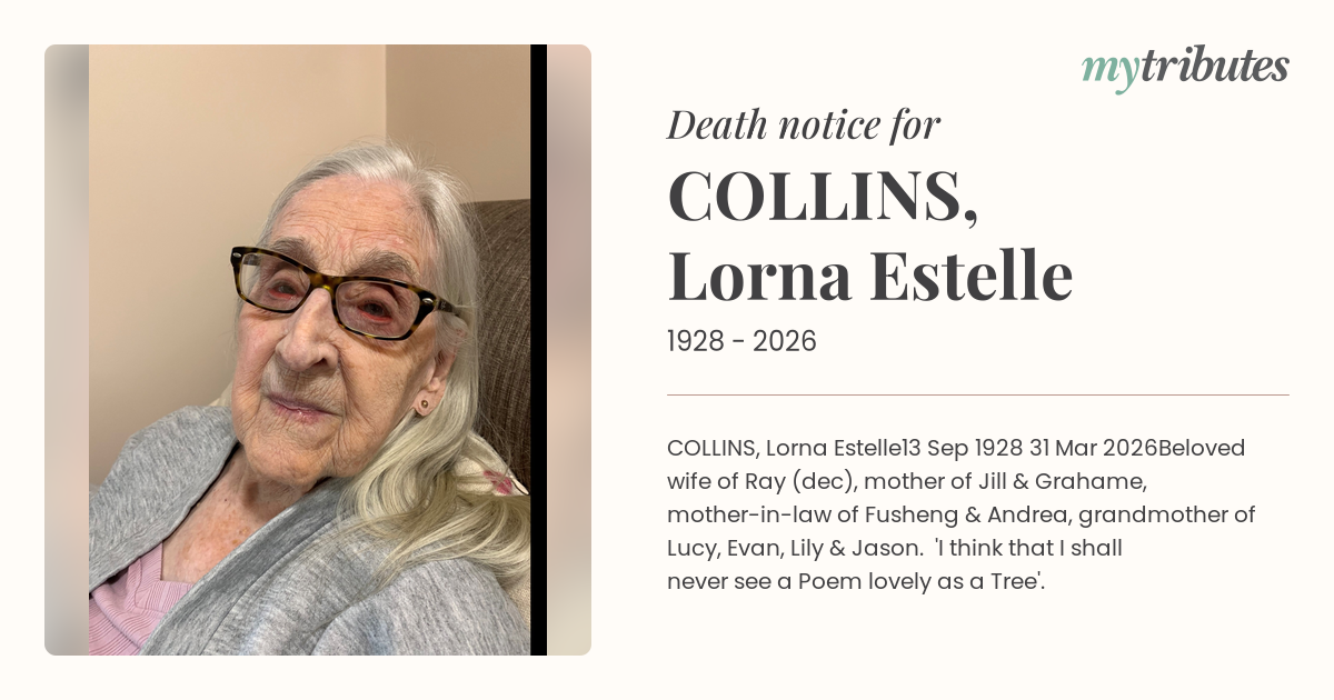 Beloved wife of Ray (dec), mother of Jill & Grahame, mother-in-law of Fusheng & Andrea, grandmother of Lucy, Evan, Lily & Jason. 'I think that I shall never see a Poem lovely as a Tree'.
