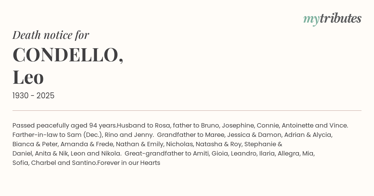 Husband to Rosa, father to Bruno, Josephine, Connie, Antoinette and Vince. Farther-in-law to Sam (Dec.), Rino and Jenny. Grandfather to Maree, Jessica & Damon, Adrian & Alycia, Bianca & Peter, Amanda & Frede, Nathan & Emily, Nicholas, Natasha & Roy, Stephanie & Daniel, Anita & Nik, Leon and Nikola. Great-grandfather to Amiti, Gioia, Leandro, Ilaria, Allegra, Mia, Sofia, Charbel and Santino.