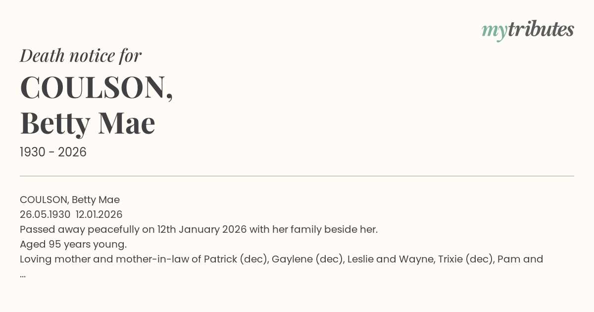 16°CCOULSON, Betty Mae 26.05.1930 – 12.01.2026 Passed away peacefully on 12th January 2026 with her family beside her. Aged 95 years young. Loving mother and mother-in-law of Patrick (dec), Gaylene (dec), Leslie and Wayne, Trixie (dec), Pam and Gilbert, Malcolm and Prue, Glenn and Janene and Nan to all her grandchildren and great-grandchildren. Treasured Memories.